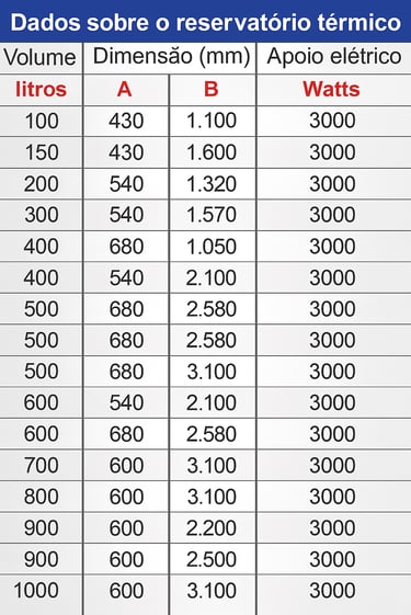 O sistema conta ainda com apoio elétrico, composto por resistência de 3.000 W e termostato de controle automático, permitindo a manutenção da temperatura da água em dias de baixa insolação ou condições climáticas desfavoráveis.